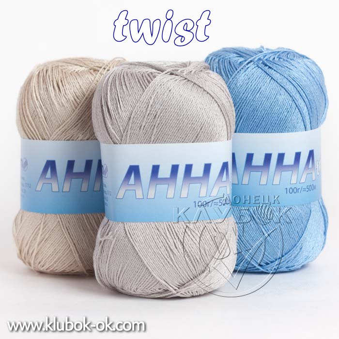 Пряжа «Анна Твист» производится по эксклюзивному заказу компании СЕАМ. Благодаря особой двойной скрутке нить ложится ровно при вязании как спицами, так и на машине, обеспечивая аккуратное полотно без перекосов в лицевой глади. Иными словами, изделие «не косит» в лицевой глади. В составе используется длинноволокнистый египетский хлопок, известный своим высоким качеством. Пряжа прошла мерсеризацию, что придало ей прочность и лёгкий блеск, при этом она осталась мягкой и приятной на ощупь.